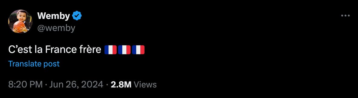 These are fun storylines for the offseason. Perhaps the Knicks win the championship, JJ Redick is the next Steve Kerr, Bronny starts (and deserves to) for the Lakers, and Cameron Johnson gets to find a new twin. Maybe, even, the 32nd team in the NBA’s expansion is based in French-speaking Montreal (since they aren’t adding a team to Paris lol).