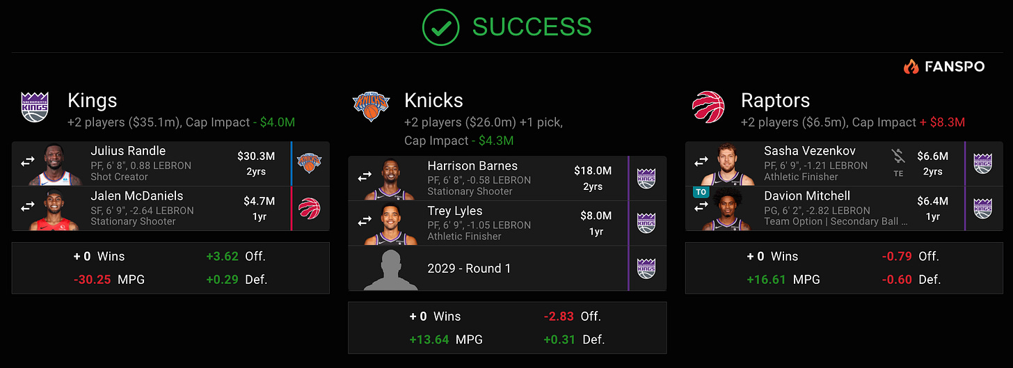 For the Kings: Does Julius Randle fit well with the Kings, other than his lefty genetics? Not especially. But he’s a talent upgrade at the 4, has improved on defense in the last few seasons, and adds needed size (not just in height but in the way he actually plays, unlike Barnes) to the Kings’ core.